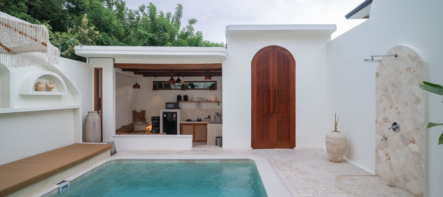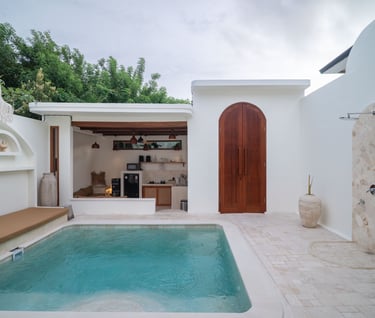 Large openings and semi outdoor areas allow natural light and ventilation to flow through the villa while strengthening the connection between the interior spaces and the pool courtyard. The result is a balanced living environment that feels private, airy, and well integrated with the relaxed atmosphere of Uluwatu.