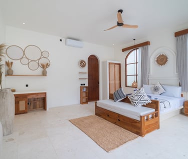 Designed for both private living and rental potential, the project focused on creating generous living spaces and a clear connection between indoor and outdoor areas. A central pool courtyard forms the heart of the villa, surrounded by distinct living zones that enhance openness and privacy. Natural materials such as Indonesian marble from Java and wood elements sourced from North Bali were incorporated to create a refined tropical atmosphere that feels both modern and authentically Balinese.