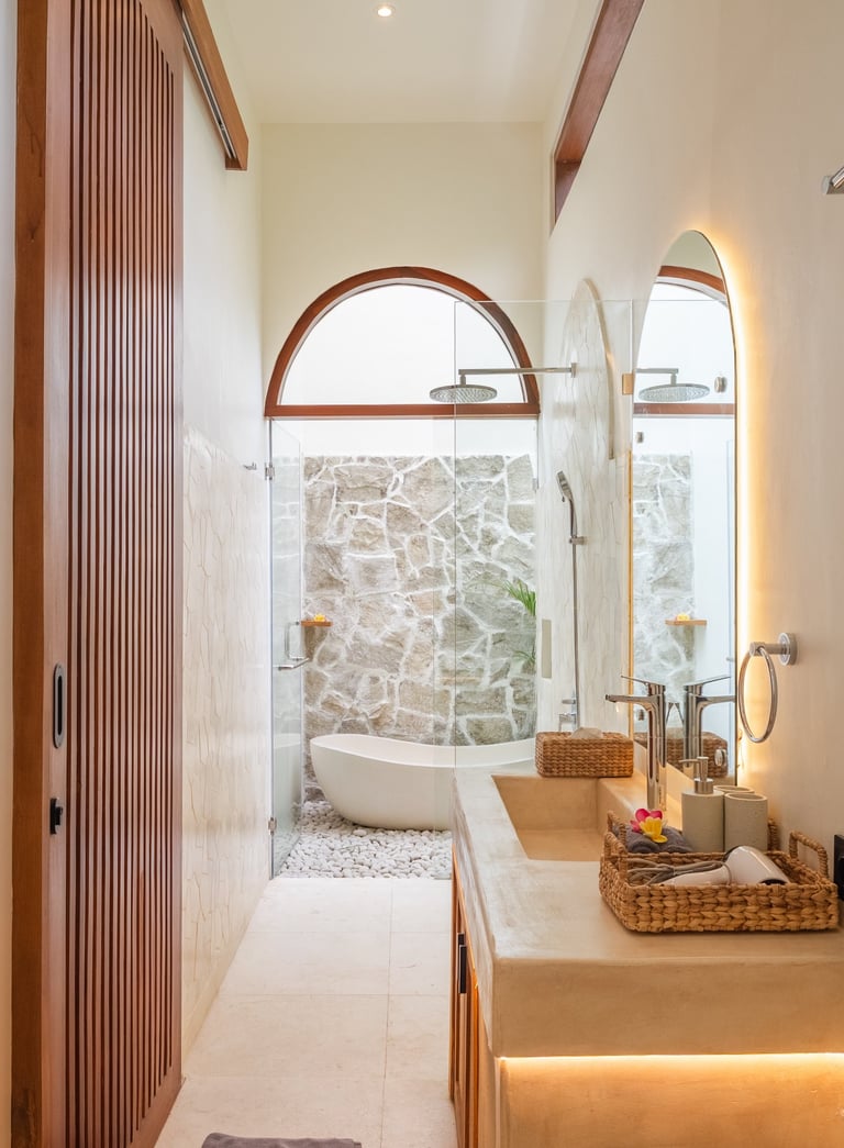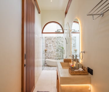 Our approach focused on creating a tropical courtyard style villa that emphasizes openness, natural textures, and a calm living atmosphere. The design incorporates arched architectural elements, natural stone finishes, and warm wood materials to bring softness and character into the space.
